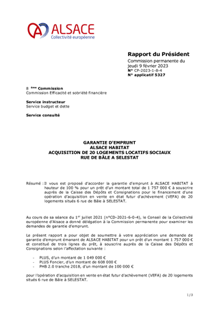 Il vous est proposé d’accorder la garantie d'emprunt à ALSACE HABITAT à hauteur de 100 % pour un prêt d’un montant total de 1 757 000 € à souscrire auprès de la Caisse des Dépôts et Consignations pour le financement d'une opération d’acquisition en vente en état futur d'achèvement (VEFA) de 20 logements situés 6 rue de Bâle à SELESTAT.