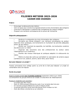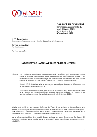 Les collégiens connaissent en moyenne 10 à 20 métiers qui conditionneront leur choix en matière d’orientation. Pour une orientation véritablement choisie, il est essentiel de leur ouvrir davantage de perspectives, notamment en leur faisant connaître des métiers d'excellence ou à fort potentiel de recrutement. Depuis 2018, la Collectivité accompagne les collèges dans cette démarche avec le dispositif « Filières Métiers ». Le présent rapport propose d’approuver le lancement d’un appel à projets visant à la création de nouvelles Filières Métiers dans les collèges de l’ensemble du territoire alsacien, pour la période septembre 2023 - juin 2026.