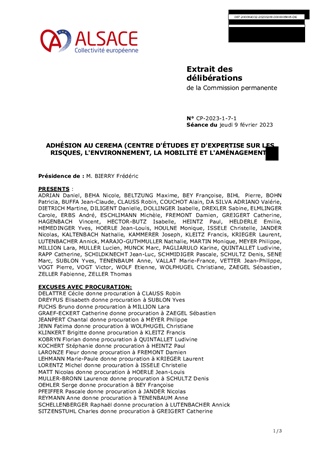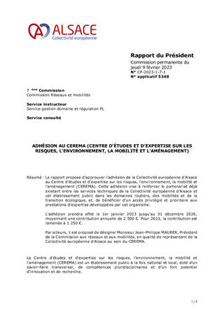 Le rapport propose d’approuver l’adhésion de la Collectivité européenne d’Alsace au Centre d'études et d'expertise sur les risques, l'environnement, la mobilité et l'aménagement (CEREMA). Cette adhésion vise à renforcer le partenariat déjà existant entre les services techniques de la Collectivité européenne d’Alsace et cet établissement public dans les domaines routiers, des mobilités et de la transition écologique, et, de bénéficier d’un accès privilégié et prioritaire aux prestations d’expertise développées par cet organisme. L’adhésion prendra effet le 1er janvier 2023 jusqu’au 31 décembre 2026, moyennant une contribution annuelle de 2 500 €. Pour 2023, la contribution est ramenée à 1 250 €. Par ailleurs, il est proposé de désigner Monsieur Jean-Philippe MAURER, Président de la Commission aux réseaux et aux mobilités, en qualité de représentant de la Collectivité européenne d’Alsace au sein du CEREMA.