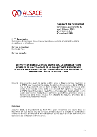 Une convention avait été signée en 2014 entre le Département du Haut-Rhin et la DREAL pour mutualiser le réseau des stations limnimétriques de la DREAL et celui du Département. Afin de tenir compte des évolutions intervenues entre temps, il convient de résilier cette convention et d'en signer une nouvelle avec la DREAL incluant Rivières de Haute Alsace. Dans ce projet de convention soumis à votre approbation, il est prévu en particulier que la DREAL prenne en charge la maintenance et la mise à niveau de 6 stations de mesures, propriétés de la Collectivité européenne d'Alsace.