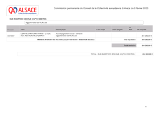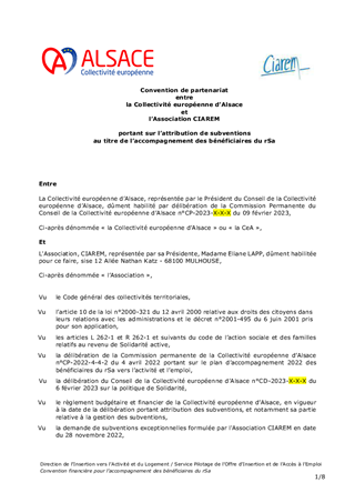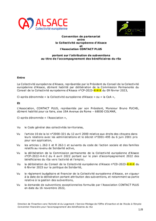 L’accompagnement des bénéficiaires du revenu de solidarité active est un axe fondamental de la politique d’insertion et d’accès à l’emploi de la Collectivité européenne d’Alsace. Aussi, afin de pouvoir préserver la capacité d’action de deux associations particulièrement essentielles en la matière sur le territoire haut-rhinois, il est proposé de leur attribuer, en début d’année, des subventions de fonctionnement de démarrage pour l’année 2023 à hauteur de 40 % des aides accordées en 2022, pour un montant total de 744 657 €, de valider les conventions afférentes et d’en autoriser leur signature par le Président de la Collectivité européenne d’Alsace.