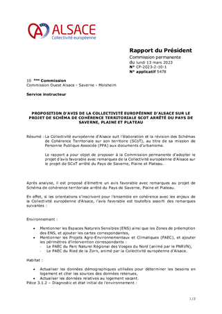 La Collectivité européenne d’Alsace suit l’élaboration et la révision des Schémas de Cohérence Territoriale sur son territoire (SCoT), au titre de sa mission de Personne Publique Associée (PPA) aux documents d’urbanisme. Le rapport a pour objet de proposer à la Commission permanente d’adopter le projet d’avis favorable avec remarques de la Collectivité européenne d’Alsace sur le projet de SCoT arrêté du Pays de Saverne, Plaine et Plateau.