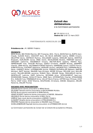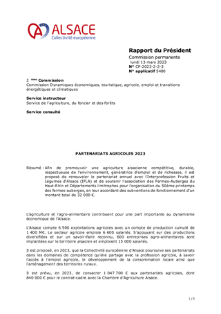 Afin de promouvoir une agriculture alsacienne compétitive, durable, respectueuse de l'environnement, génératrice d’emploi et de richesses, il est proposé de renouveler le partenariat annuel avec l'Interprofession Fruits et Légumes d'Alsace (IFLA) et de soutenir l'association des Fermes-Auberges du Haut-Rhin et Départements limitrophes pour l'organisation du 50ème printemps des fermes-auberges, en leur accordant des subventions de fonctionnement d'un montant total de 32 000 €.