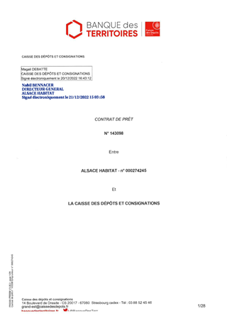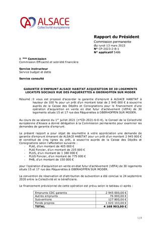Il vous est proposé d’accorder la garantie d'emprunt à ALSACE HABITAT à hauteur de 100 % pour un prêt d’un montant total de 2 945 000 € à souscrire auprès de la Caisse des Dépôts et Consignations pour le financement d'une opération d’acquisition en vente en état futur d'achèvement (VEFA) de 30 logements situés 15 et 17 rue des Pâquerettes à OBERHOFFEN SUR MODER.