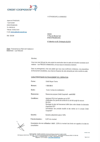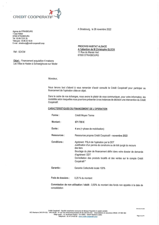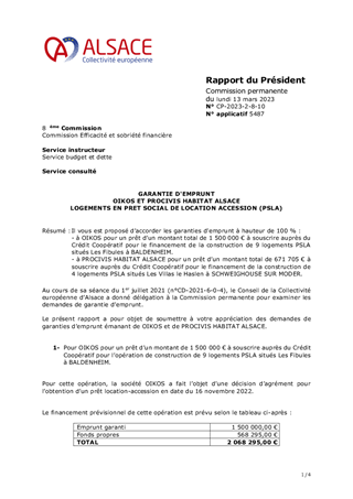Il vous est proposé d’accorder les garanties d'emprunt à hauteur de 100 % : - à OIKOS pour un prêt d’un montant total de 1 500 000 € à souscrire auprès du Crédit Coopératif pour le financement de la construction de 9 logements PSLA situés Les Fibules à BALDENHEIM. - à PROCIVIS HABITAT ALSACE pour un prêt d’un montant total de 671 705 € à souscrire auprès du Crédit Coopératif pour le financement de la construction de 4 logements PSLA situés Les Villas le Haslen à SCHWEIGHOUSE SUR MODER.