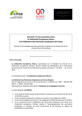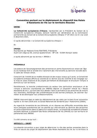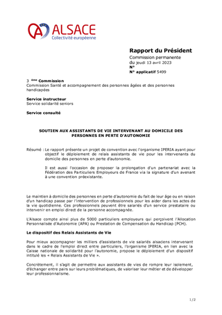 Le rapport présente un projet de convention avec l'organisme IPERIA ayant pour objectif le déploiement de relais assistants de vie pour les intervenants du domicile des personnes en perte d’autonomie. Il est aussi l'occasion de proposer la prolongation d'un partenariat avec la Fédération des Particuliers Employeurs de France via la signature d'un avenant à une convention préexistante.