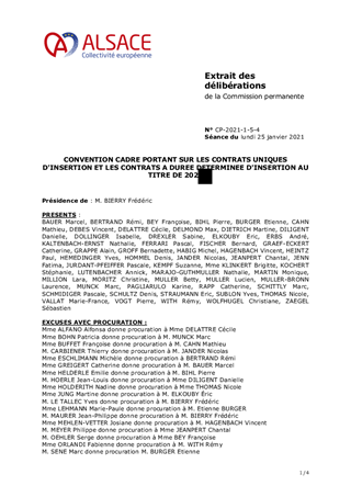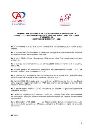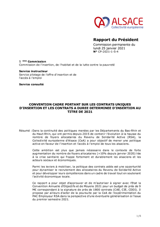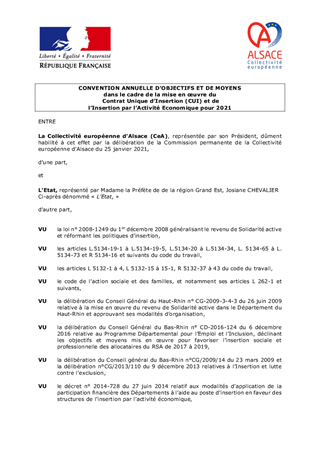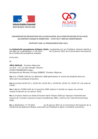 Dans la continuité des politiques menées par les Départements du Bas-Rhin et du Haut-Rhin, qui ont permis depuis 2015 de contenir l’évolution à la hausse du nombre de foyers allocataires du Revenu de Solidarité Active (RSA), la Collectivité européenne d’Alsace (CeA) a pour objectif de mener une politique active en faveur de l’insertion et l’accès à l’emploi de tous les alsaciens. Cette ambition est plus que jamais nécessaire dans le contexte de forte augmentation du nombre de foyers allocataires (+10% depuis janvier 2020) liée à la crise sanitaire qui frappe fortement et durablement les alsaciens et les acteurs sociaux et économiques. Parmi les leviers à mobiliser, la politique des contrats aidés est une opportunité pour dynamiser le recrutement des allocataires du Revenu de Solidarité Active et pour développer leurs compétences dans un cadre de travail tout en soutenant l’activité économique locale. Ce rapport a pour objet d’approuver et de m’autoriser à signer avec l’Etat la Convention Annuelle d’Objectifs et de Moyens 2021 pour un budget de près de 9 M€ correspondant à la signature de près de 1800 contrats (CAE, CIE, CDDI). Il propose par ailleurs d'acter de la poursuite par la CeA de l’expérimentation du PAC Employeur RSA dans la perspective d’une éventuelle généralisation à l’issue du premier semestre 2021.