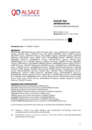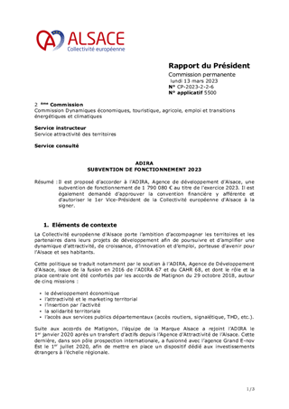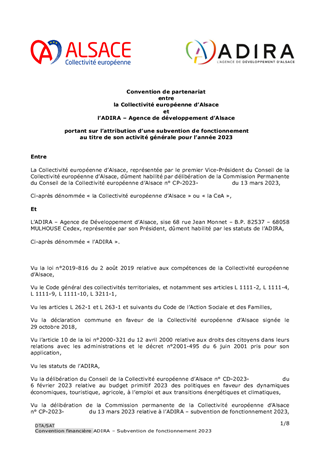 Il est proposé d'accorder à l'ADIRA, Agence de développement d'Alsace, une subvention de fonctionnement de 1 790 080 € au titre de l'exercice 2023. Il est également demandé d'approuver la convention financière y afférente et d'autoriser le 1er Vice-Président de la Collectivité européenne d'Alsace à la signer.