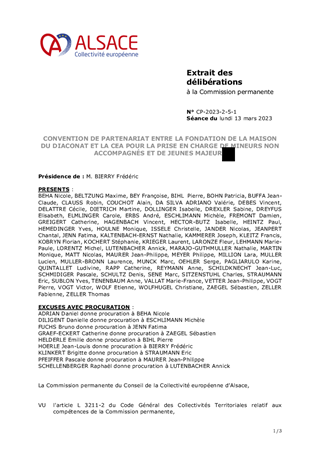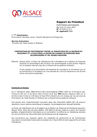 Depuis 2019, le Foyer de l’Adolescent de la Fondation de la Maison du Diaconat accueille et accompagne des mineurs non accompagnés et des jeunes majeurs sur orientation des services de la Collectivité européenne d’Alsace. Il est proposé à la Commission permanente de reconduire la convention qui lie la Collectivité à la Fondation sur une période de 3 ans et d’approuver les termes d’une convention actualisée.