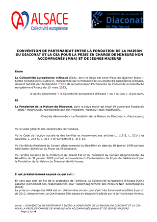 CONVENTION DE PARTENARIAT ENTRE LA FONDATION DE LA MAISON DU DIACONAT ET LA CEA POUR LA PRISE EN CHARGE DE MINEURS NON ACCOMPAGNÉS ET DE JEUNES MAJEURS