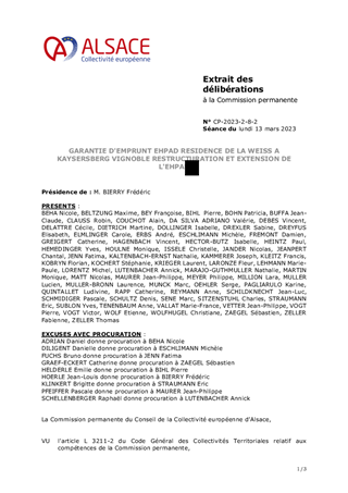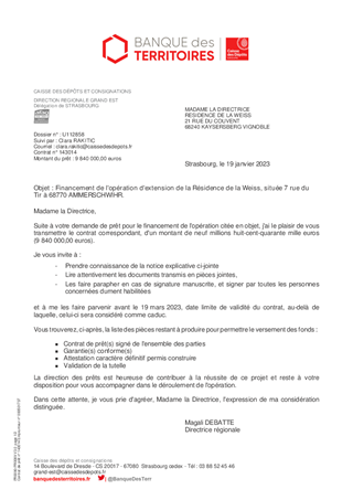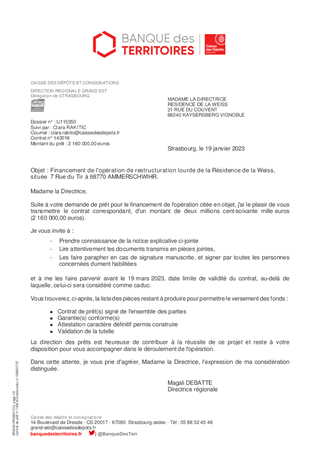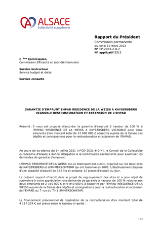 Il vous est proposé d’accorder la garantie d'emprunt à hauteur de 100 % à l’EHPAD RESIDENCE DE LA WEISS A KAYSERSBERG VIGNOBLE pour deux emprunts d’un montant total de 12 000 000 € souscrits auprès de la Caisse des dépôts et consignations pour la restructuration et extension de l’EHPAD.