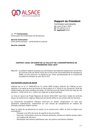 Le présent rapport propose à la commission permanente d’approuver les termes du Contrat Local de Santé (CLS) de la Ville et de l’Eurométropole de Strasbourg (EMS) et d’en autoriser la signature par l’élue représentante de la Collectivité européenne d’Alsace au sein de ce CLS.