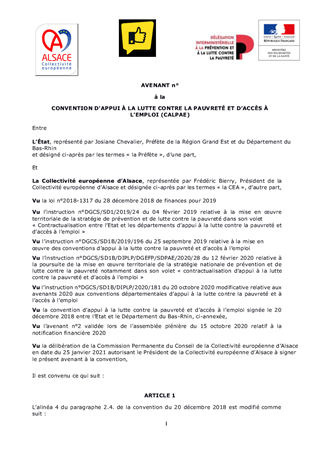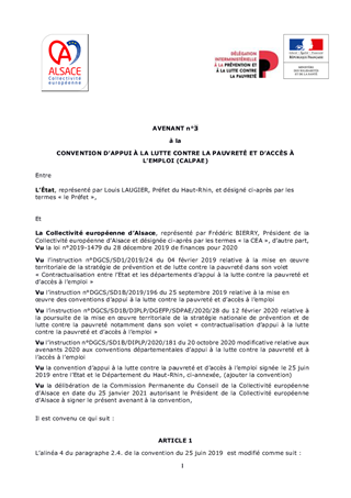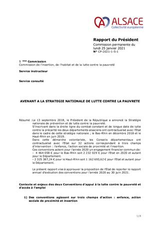 Le 13 septembre 2018, le Président de la République a annoncé la Stratégie nationale de prévention et de lutte contre la pauvreté. S’inscrivant dans la droite ligne du combat constant et de longue date de lutte contre la précarité les deux départements alsaciens ont contractualisé avec l’Etat dans le cadre de cette stratégie nationale ; le Bas-Rhin en décembre 2018 et le Haut-Rhin en juin 2019. Dans cette démarche volontariste, les Conseils départementaux ont contractualisé avec l’Etat sur 32 actions correspondant à trois champs d’intervention : l’enfance, l’action sociale de proximité et l’insertion. Ces conventions actent pour l’année 2020 un engagement financier commun de: - 4 464 058 € pour le Bas-Rhin soit 2 232 029 € pour l’Etat en 2020 et autant pour le Département. - 2 325 387,24 € pour le Haut-Rhin soit 1 162 693,62 € pour l’Etat et autant pour le Département. Le présent rapport vise à approuver la proposition de l’Etat de reporter le rapport annuel d’exécution des conventions pour l’année 2020 au 30 juin 2021.
