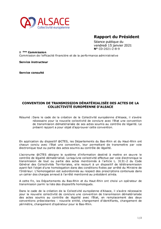Dans le cade de la création de la Collectivité européenne d'Alsace, il s’avère nécessaire pour la nouvelle collectivité de conclure avec l'Etat une convention de transmission dématérialisée de ses actes soumis au contrôle de légalité. Le présent rapport a pour objet d’approuver cette convention.