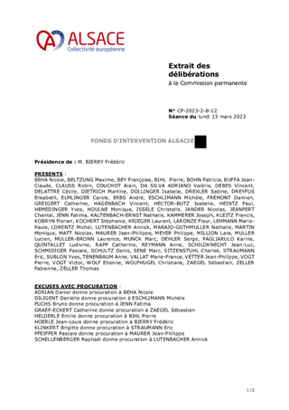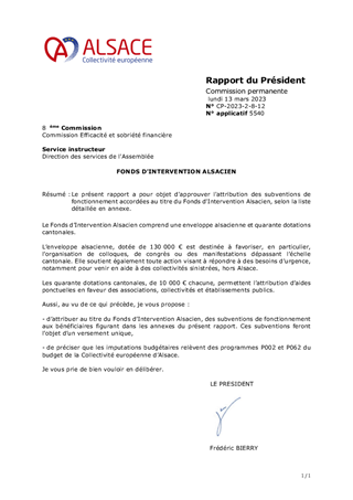 Le présent rapport a pour objet d'approuver l'attribution des subventions de fonctionnement accordées au titre du Fonds d'Intervention Alsacien, selon la liste détaillée en annexe.