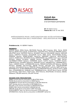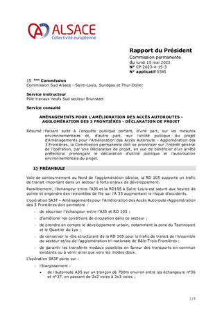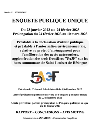 Faisant suite à l’enquête publique portant, d'une part, sur les mesures environnementales et, d'autre part, sur l’utilité publique du projet d'Aménagements pour l'Amélioration des Accès Autoroute - Agglomération des 3 Frontières, la Commission permanente doit se prononcer sur l'intérêt général de l'opération, par une Déclaration de projet, en vue de bénéficier d’un arrêté préfectoral prononçant le déclaration d’utilité publique et l’autorisation environnementale du projet.