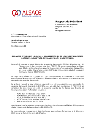 Il vous est proposé d’accorder la garantie d'emprunt à DOMIAL à hauteur de 100 % pour un prêt d’un montant total de 4 708 955 € à souscrire auprès de la Caisse des Dépôts et Consignations pour le financement d'une opération d’acquisition en vente en état futur d'achèvement (VEFA) de 32 logements situés 9 boulevard Guillaume Koch à BOUXWILLER.