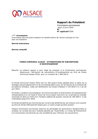 Le présent rapport a pour objet de proposer à la Commission permanente d'approuver l'attribution de subventions d'investissement au titre du Fonds Communal Alsace (FCA), pour un montant de 1 895 992 €.