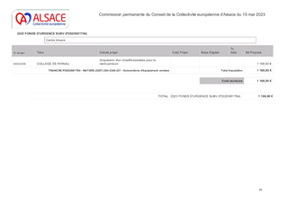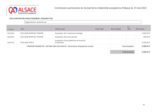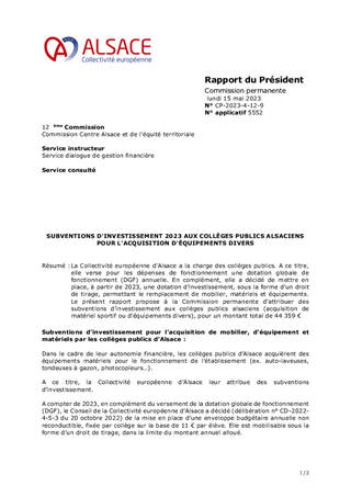 La Collectivité européenne d’Alsace a la charge des collèges publics. A ce titre, elle verse pour les dépenses de fonctionnement une dotation globale de fonctionnement (DGF) annuelle. En complément, elle a décidé de mettre en place, à partir de 2023, une dotation d’investissement, sous la forme d’un droit de tirage, permettant le remplacement de mobilier, matériels et équipements. Le présent rapport propose à la Commission permanente d’attribuer des subventions d’investissement aux collèges publics alsaciens (acquisition de matériel sportif ou d'équipements divers), pour un montant total de 44 359 €