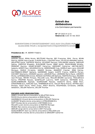SUBVENTIONS D'INVESTISSEMENT 2023 AUX COLLÈGES PUBLICS ALSACIENS POUR L'ACQUISITION D'ÉQUIPEMENTS DIVERS