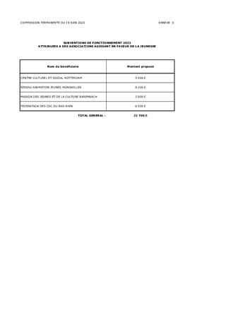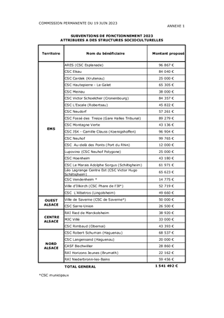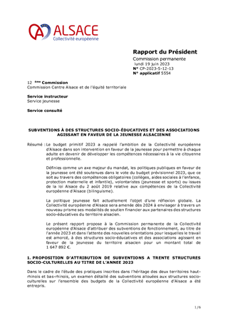Le budget primitif 2023 a rappelé l’ambition de la Collectivité européenne d’Alsace dans son intervention en faveur de la jeunesse pour permettre à chaque adulte en devenir de développer les compétences nécessaires à la vie citoyenne et professionnelle. Définies comme un axe majeur du mandat, les politiques publiques en faveur de la jeunesse ont été soutenues dans le vote du budget prévisionnel 2023, que ce soit au travers des compétences obligatoires (collèges, aides sociales à l’enfance, protection maternelle et infantile), volontaristes (jeunesse et sports) ou issues de la loi Alsace du 2 août 2019 relative aux compétences de la Collectivité européenne d’Alsace (bilinguisme). La politique jeunesse fait actuellement l’objet d’une réflexion globale. La Collectivité européenne d’Alsace sera amenée dès 2024 à envisager à travers un nouveau prisme ses modalités de soutien financier aux partenaires des structures socio-éducatives du territoire alsacien. Le présent rapport propose à la Commission permanente de la Collectivité européenne d’Alsace d'attribuer des subventions de fonctionnement, au titre de l'année 2023 et dans l’attente des nouvelles orientations pour lesquelles le travail est amorcé, à des structures socio-éducatives et des associations agissant en faveur de la jeunesse du territoire alsacien pour un montant total de 1 647 892 €.