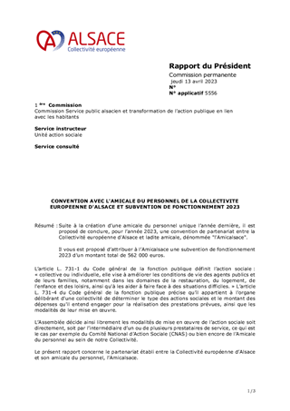 Suite à la création d’une amicale du personnel unique l’année dernière, il est proposé de conclure, pour l’année 2023, une convention de partenariat entre la Collectivité européenne d'Alsace et ladite amicale, dénommée "l'Amicalsace". Il vous est proposé d’attribuer à l’Amicalsace une subvention de fonctionnement 2023 d’un montant total de 562 000 euros.