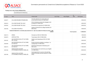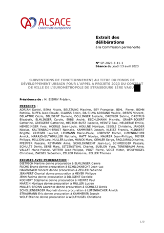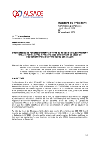 Le présent rapport a pour objet de proposer à la Commission permanente de décider d’attribuer des subventions de fonctionnement pour un montant total de 265 730 € concernant les projets pour lesquels la Collectivité européenne d'Alsace a été sollicitée au titre du fonds de développement urbain, dans le cadre de l'appel à projets 2023 du Contrat de Ville de l’Eurométropole de Strasbourg.