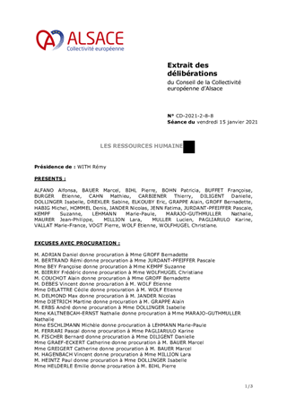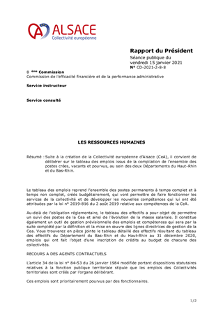 Suite à la création de la Collectivité européenne d’Alsace (CeA), il convient de délibérer sur le tableau des emplois issus de la compilation de l’ensemble des postes crées, vacants et pourvus, au sein des deux Départements du Haut-Rhin et du Bas-Rhin.