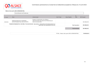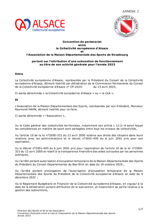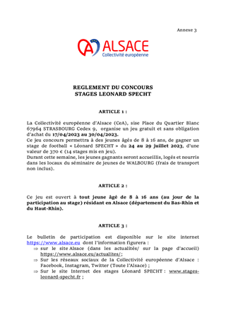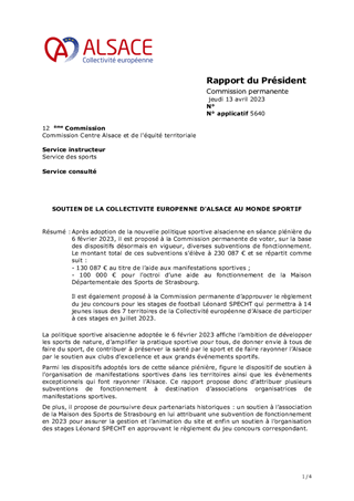 Après adoption de la nouvelle politique sportive alsacienne en séance plénière du 6 février 2023, il est proposé à la Commission permanente de voter, sur la base des dispositifs désormais en vigueur, diverses subventions de fonctionnement. Le montant total de ces subventions s’élève à 230 087 € et se répartit comme suit : - 130 087 € au titre de l’aide aux manifestations sportives ; - 100 000 € pour l’octroi d’une aide au fonctionnement de la Maison Départementale des Sports de Strasbourg. Il est également proposé à la Commission permanente d’approuver le règlement du jeu concours pour les stages de football Léonard SPECHT qui permettra à 14 jeunes issus des 7 territoires de la Collectivité européenne d’Alsace de participer à ces stages en juillet 2023.