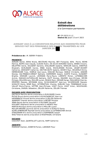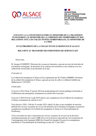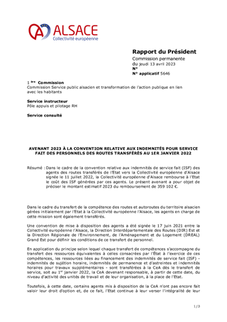 Dans le cadre de la convention relative aux indemnités de service fait (ISF) des agents des routes transférés de l’Etat vers la Collectivité européenne d’Alsace signée le 11 juillet 2022, la Collectivité européenne d'Alsace rembourse à l’Etat le coût des ISF générées par ces agents. Le présent avenant a pour objet de préciser le montant estimatif 2023 du remboursement de 359 102 €.