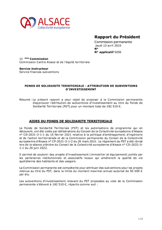 Le présent rapport a pour objet de proposer à la Commission permanente d'approuver l'attribution de subventions d'investissement au titre du Fonds de Solidarité Territoriale (FST) pour un montant total de 182 510 €.
