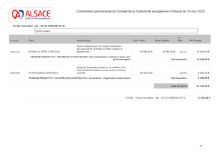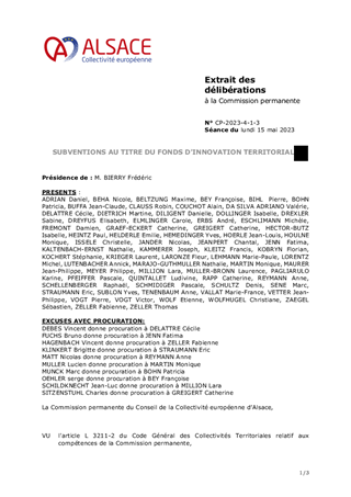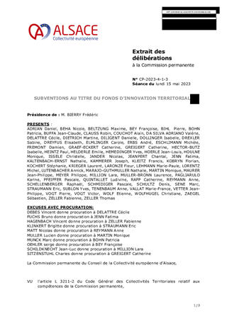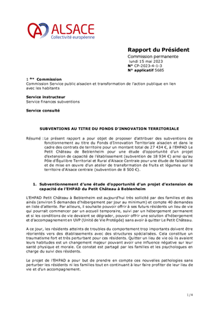 Le présent rapport a pour objet de proposer d'attribuer des subventions de fonctionnement au titre du Fonds d'Innovation Territoriale alsacien et dans le cadre des contrats de territoire pour un montant total de 27 434 €, à l'EHPAD Le Petit Château de Beblenheim pour une étude d’opportunité d’un projet d’extension de capacité de l'établissement (subvention de 18 934 €) ainsi qu'au Pôle d’Équilibre Territorial et Rural d'Alsace Centrale pour une étude de faisabilité et de mise en œuvre d’un atelier de transformation de fruits et légumes sur le territoire d’Alsace centrale (subvention de 8 500 €).