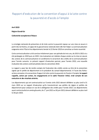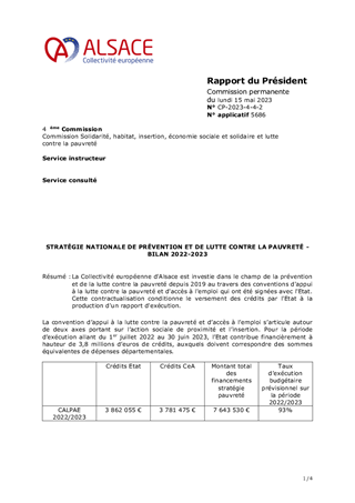 La Collectivité européenne d'Alsace est investie dans le champ de la prévention et de la lutte contre la pauvreté depuis 2019 au travers des conventions d'appui à la lutte contre la pauvreté et d'accès à l'emploi qui ont été signées avec l'Etat. Cette contractualisation conditionne le versement des crédits par l'Etat à la production d'un rapport d'exécution.