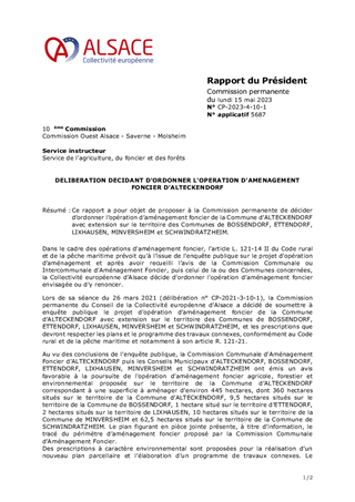 Ce rapport a pour objet de proposer à la Commission permanente de décider d’ordonner l’opération d’aménagement foncier de la Commune d’ALTECKENDORF avec extension sur le territoire des Communes de BOSSENDORF, ETTENDORF, LIXHAUSEN, MINVERSHEIM et SCHWINDRATZHEIM.
