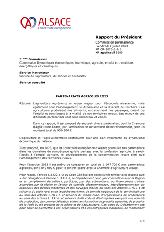 L’agriculture représente un enjeu majeur pour l’économie alsacienne, mais également pour l’aménagement, le dynamisme et la diversité du territoire. Les agriculteurs produisent nos aliments, entretiennent nos paysages, créent de l’emploi et contribuent à la vitalité de nos territoires ruraux. Les enjeux de ces différents partenariats sont donc nombreux et variés. Dans ce rapport, il est proposé de soutenir divers partenaires, dont la Chambre d'Agriculture Alsace, par l'attribution de subventions de fonctionnement, pour un montant total de 930 500 €.