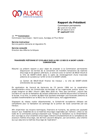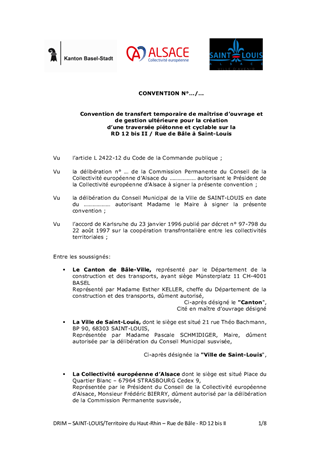 Le présent rapport a pour objet de proposer à la Commission permanente d’approuver les termes de la convention de transfert temporaire de maîtrise d’ouvrage et de gestion ultérieure, à conclure avec le Canton de BALE-VILLE et la Ville de SAINT-LOUIS dans le cadre de l’aménagement d’une traversée piétonne et cyclable sur la RD 12 bis II à SAINT-LOUIS. Le Canton de BALE-VILLE finance les travaux ; la ville de SAINT-LOUIS entretiendra les ouvrages.