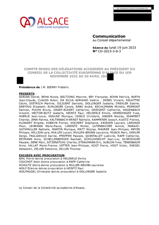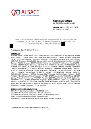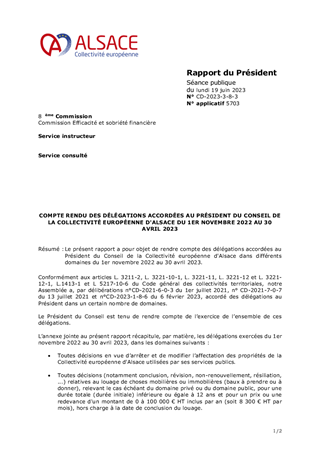 Le présent rapport a pour objet de rendre compte des délégations accordées au Président du Conseil de la Collectivité européenne d'Alsace dans différents domaines du 1er novembre 2022 au 30 avril 2023.