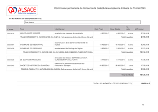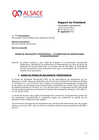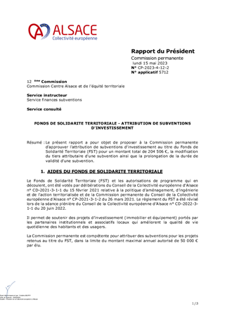 Le présent rapport a pour objet de proposer à la Commission permanente d'approuver l'attribution de subventions d'investissement au titre du Fonds de Solidarité Territoriale (FST) pour un montant total de 204 506 €, la modification du tiers attributaire d'une subvention ainsi que la prolongation de la durée de validité d'une subvention.