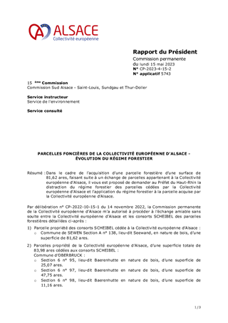 Dans le cadre de l’acquisition d’une parcelle forestière d’une surface de 81,62 ares, faisant suite à un échange de parcelles appartenant à la Collectivité européenne d’Alsace, il vous est proposé de demander au Préfet du Haut-Rhin la distraction du régime forestier des parcelles cédées par la Collectivité européenne d’Alsace et l’application du régime forestier à la parcelle acquise par la Collectivité européenne d’Alsace.
