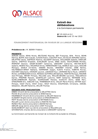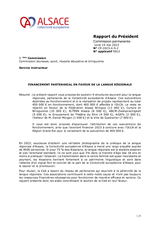 Le présent rapport vous propose de soutenir 9 structures œuvrant pour la langue régionale, partenaires de la Collectivité européenne d’Alsace. Ces subventions destinées au fonctionnement et à la réalisation de projets représentent au total 450 000 € en fonctionnement, dont 400 000 € affectés à l’OLCA. Le reste se répartit en faveur de la Fédération Alsace Bilingue (12 000 €), Culture et Bilinguisme (10 000 €), ELTERN Alsace (8 000 €), ABCM-Zweisprachigkeit (5 000 €), le Groupement de Théâtre du Rhin (4 500 €), AGATe (2 500 €), l’éditeur de M. Daniel Morgen (1 000 €) et la Ville de Guebwiller (7 000 €). Il vous est donc proposé d’approuver l'attribution de ces subventions de fonctionnement, ainsi que l’avenant financier 2023 à conclure avec l'OLCA et la Région Grand Est pour le versement de la subvention de 400 000 €.
