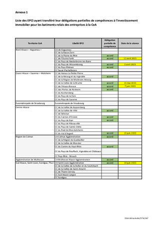La Collectivité européenne d'Alsace, de par ses compétences et son action est un acteur important de l’écosystème économique en Alsace. En 2023 la Collectivité poursuit et consolide son engagement en faveur de l’économie de proximité en mobilisant l’ensemble de ses leviers pour agir sur l’environnement des entreprises (mobilité, énergie, orientation des jeunes, emploi, logement), en mobilisant son réseau d'ingénierie (ADT et ADIRA notamment) et en fructifiant les partenariats noués en 2022 avec les trois chambres consulaires notamment. Par ailleurs, notre collectivité maintient en 2023 un haut niveau d’investissement public en soutien aux entreprises du BTP pour nos collèges (74,7 M€), nos bâtiments (28,1 M€), nos routes (121 M€), ou encore en faveur de l’économie touristique notamment dans le cadre du plan Avenir Montagne (2 M€ pour le tourisme, 0,9 M€ pour la montagne). Il est ainsi proposé que la Collectivité européenne d’Alsace assure auprès de ses territoires, pour accompagner leur développement, un rôle fédérateur autour d’une politique d’attractivité économique convergente sur l'immobilier d'entreprises. La Collectivité européenne d'Alsace, en acceptant les délégations partielles de compétence proposées en faveur de l’immobilier d’entreprises, consolidera son action en faveur de l’économie de proximité et mobilisera ALSABAIL au bénéfice d’une économie durable et socialement responsable pour accompagner la résilience de ses territoires et des entreprises. Le présent rapport a pour objet de définir les conditions de la mise en oeuvre de cette politique : l'acceptation des délégations de compétence partielle de 6 intercommunalités volontaires d'Alsace, qui se font dans le parfait respect de tous les acteurs de la sphère publique locale. Il vous est ainsi demandé de prendre acte de la création, par 6 intercommunalités d'Alsace, d'un dispositif d’aide à l’immobilier d’entreprises intitulé « Fonds de soutien à l’investissement immobilier pour les bâtiments relais des entreprises » et d'accepter, de la part des 6 intercommunalités volontaires d'Alsace, la délégation de la compétence d’octroi des aides relevant du dispositif d’aides à l’immobilier d’entreprises précité.