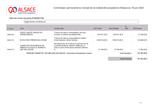 Le soutien aux dépenses d’investissement des collèges privés sous contrats d’association ne relève pas d’une obligation mais d’une possibilité qui est offerte, conformément aux articles L.151-4 et L.442-16 du code de l’éducation. Le présent rapport a pour objet de proposer à la Commission permanente de décider du montant de la subvention d’investissement à attribuer aux 20 établissements privés sous contrat (sur 25) ayant sollicité une participation financière de la Collectivité européenne d’Alsace, au titre des investissements réalisés en 2023, pour un montant global de subventions de 973 937 €.