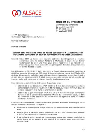 Citivia-SEM va lancer une nouvelle opération d'aménagement à vocation économique dans le secteur Fonderie à Mulhouse. Il s'agit de lui donner l'autorisation de créer une filiale pour piloter l'opération et de répondre au troisième appel de fonds consécutif à la participation de la CeA à l'augmentation de capital décidée en 2019.