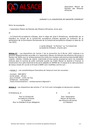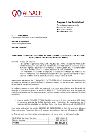 Il vous est proposé : - d’accorder la garantie d'emprunt à hauteur de 100 % à la société PIERRES ET TERRITOIRES pour un prêt d’un montant total de 438 000 € à souscrire auprès du Crédit Agricole pour le financement de la construction de 3 logements PSLA situés Rue de l’Eau Claire – Le Jazzy Bâtiment A à DRUSENHEIM. - de maintenir la garantie d’emprunt à l’association Maison de Retraite des Missions Africaines pour financer la construction d’un pôle d’activité et de soins adaptés en EHPAD et la restructuration de locaux situés à BARR.