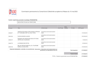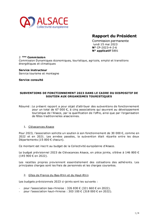 Le présent rapport a pour objet d’attribuer des subventions de fonctionnement pour un total de 67 000 €, à cinq associations qui œuvrent au développement touristique de l’Alsace, par la qualification de l’offre, ainsi que par l’organisation de fêtes traditionnelles alsaciennes.