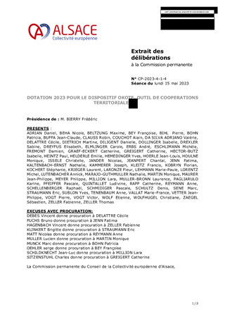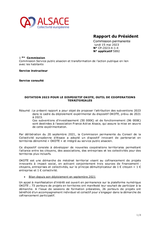 Le présent rapport a pour objet de proposer l’attribution des subventions 2023 dans le cadre du déploiement expérimental du dispositif OKOTE, prévu de 2021 à 2023. Ces subventions d’investissement (50 000€) et de fonctionnement (96 000€) sont destinées à l’association France Active Alsace, qui assure la mise en œuvre de cette expérimentation.