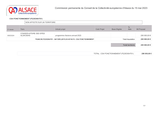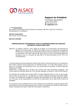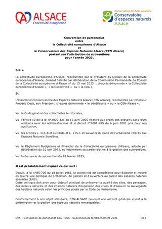 Le présent rapport a pour objet de proposer à la Commission permanente de décider de la poursuite, en 2023, des actions entre la Collectivité européenne d’Alsace et le Conservatoire des Espaces Naturels Alsace relatives à la gestion et la valorisation des sites relevant de notre action au titre des Espaces Naturels Sensibles, pour un montant de 296 050 € en fonctionnement et 23 741 € en investissement.