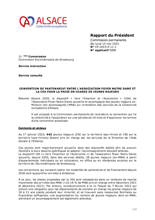 Depuis 2020, le dispositif « Vers l’Insertion et l’Autonomie » (VIA) de l’Association Foyer Notre Dame accueille et accompagne des jeunes majeurs ex-Mineurs non accompagnés (MNA) sur orientation des services de la Collectivité européenne d’Alsace. Il est proposé à la Commission permanente de reconduire la convention qui lie la collectivité à l’association sur une période de 10 mois et d’approuver les termes d’une convention actualisée.
