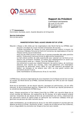 L’Alsace a été ciblée par les organisateurs des World Series by UTMB® pour accueillir une étape du circuit mondial comprenant 35 courses. L’intérêt touristique de l’Alsace et plus particulièrement castral à travers les nombreux Châteaux Forts du territoire ont convaincu les organisateurs d’inscrire l’Alsace comme nouvel événement. Avec plus de 4700 coureurs inscrits aux 4 courses proposées dès cette première édition, l’événement s’annonce d’ores et déjà comme exceptionnel. La CeA entend profiter de cette opportunité pour valoriser son territoire et en assurer une promotion mondiale, et mettra plus spécifiquement en avant une communication axée sur « Alsace, Terre de Châteaux Forts ». Cet événement a aussi pour objectif d’associer les publics locaux, de nombreux alsaciens sont inscrits aux courses, mais c’est également une mobilisation importante de bénévoles locaux (600) et une fête populaire permettant de fédérer les énergies et les acteurs pour offrir au plus grand nombre des animations durant 4 jours. Cette manifestation se déroulera du 18 au 21 mai 2023.
