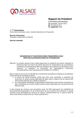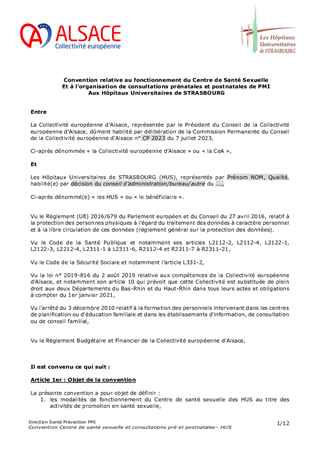 Le présent rapport a pour objet d’approuver le projet de convention régissant le fonctionnement du Centre de Santé Sexuelle et l’organisation de consultations prénatales et postnatales de PMI aux Hôpitaux Universitaires de Strasbourg, d’en autoriser la signature et d’accorder les participations financières correspondantes, soit respectivement 94 000 € et 20 000 €.